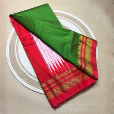 A bold temple-style chikki paras border, intricate butta weaving, and the signature Ilkal Tope Jari Pallu elevate its traditional charm.