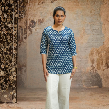 Designed with a round neckline with subtle slit detailing and 3/4th sleeves, it offers a relaxed fit that pairs beautifully with white pants, leggings, or denim—perfect for office wear, casual outings, and everyday styling.