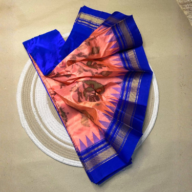 A premium handloom Ilkal Pure Silk saree featuring an exquisite peach ikat body, deep royal blue contrast border, and the traditional Ilkal Tope Pallu. Finished with a detailed chikki paras...