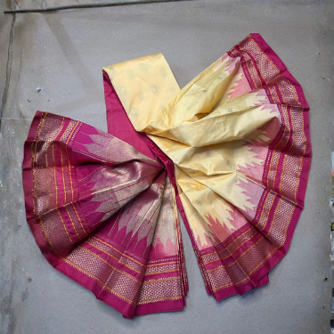 A vibrant Ilkal Temple Saree crafted from a blend of mercerised cotton and PC silk, featuring a striking temple border, butta motifs, and the classic Ilkal Tope Jari Pallu. Paired...