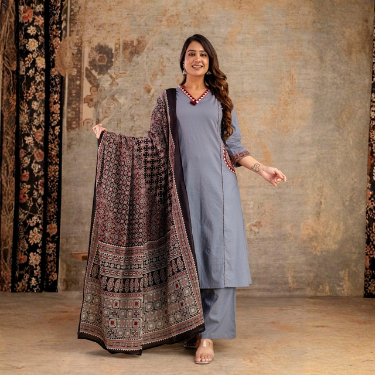 The highlight of the set is the intricately printed dupatta, showcasing rich traditional patterns in earthy tones that complement the cool grey base perfectly. Ideal for casual outings, festive gatherings, and semi-formal occasions, this ensemble brings together elegance and effortless wearability.