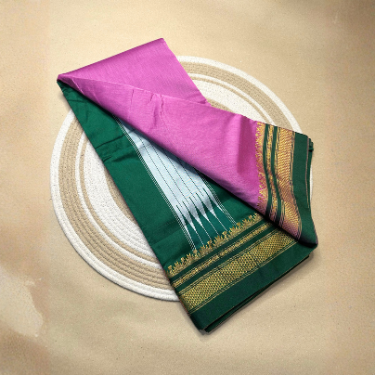 The saree features a harmonious blend of mercerised cotton and PC silk, giving it a soft texture, graceful fall, and subtle sheen.