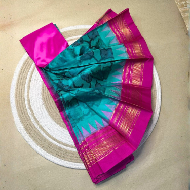 A premium pure silk Ilkal saree featuring a rich teal green body, stunning rani pink border, traditional chikki paras weaving, and a signature Ilkal Tope pallu. Handwoven elegance with vibrant...