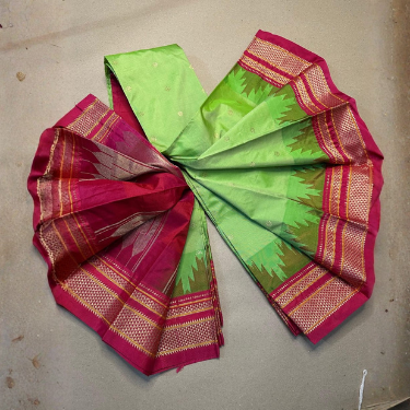 A vibrant Ilkal Temple Saree crafted from a blend of mercerised cotton and PC silk, featuring a striking temple border, butta motifs, and the classic Ilkal Tope Jari Pallu. Paired...